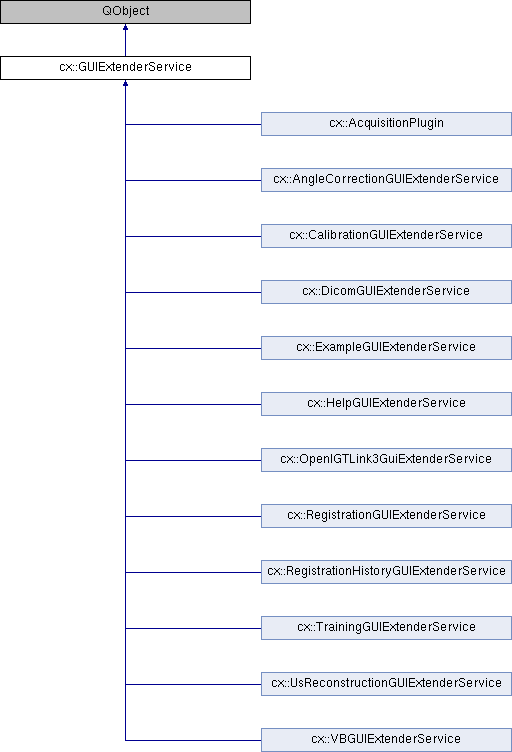 Implemented in cx::AngleCorrectionGUIExtenderService, cx::AcquisitionPlugin, cx::DicomGUIExtenderService, cx::HelpGUIExtenderService, cx::RegistrationHistoryGUIExtenderService, cx::TrainingGUIExtenderService, cx::CalibrationGUIExtenderService, cx::OpenIGTLink3GuiExtenderService, cx::ExampleGUIExtenderService, cx::RegistrationGUIExtenderService, cx::UsReconstructionGUIExtenderService, and cx::VBGUIExtenderService.