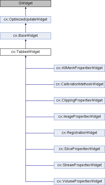 cx::BaseWidget cx::OptimizedUpdateWidget cx::AllMeshPropertiesWidget cx::CalibrationMethodsWidget cx::ClippingPropertiesWidget cx::ImagePropertiesWidget cx::RegistrationWidget cx::SlicePropertiesWidget cx::StreamPropertiesWidget cx::VolumePropertiesWidget