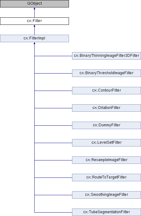 Implemented in cx::TubeSegmentationFilter, cx::RouteToTargetFilter, cx::BinaryThresholdImageFilter, cx::ContourFilter, cx::LevelSetFilter, cx::BinaryThinningImageFilter3DFilter, cx::SmoothingImageFilter, cx::DummyFilter, cx::ResampleImageFilter, and cx::DilationFilter.