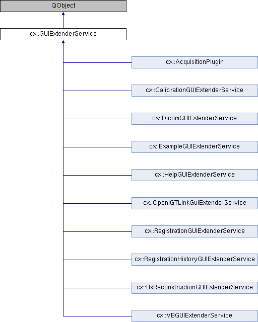 Implemented in cx::AcquisitionPlugin, cx::DicomGUIExtenderService, cx::HelpGUIExtenderService, cx::RegistrationHistoryGUIExtenderService, cx::CalibrationGUIExtenderService, cx::ExampleGUIExtenderService, cx::RegistrationGUIExtenderService, cx::UsReconstructionGUIExtenderService, cx::VBGUIExtenderService, and cx::OpenIGTLinkGuiExtenderService.