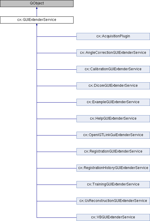 Implemented in cx::AcquisitionPlugin, cx::AngleCorrectionGUIExtenderService, cx::DicomGUIExtenderService, cx::HelpGUIExtenderService, cx::RegistrationHistoryGUIExtenderService, cx::TrainingGUIExtenderService, cx::CalibrationGUIExtenderService, cx::ExampleGUIExtenderService, cx::RegistrationGUIExtenderService, cx::UsReconstructionGUIExtenderService, cx::VBGUIExtenderService, and cx::OpenIGTLinkGuiExtenderService.