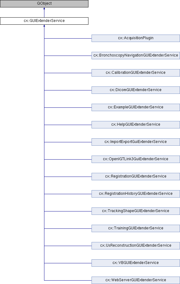 Implemented in cx::BronchoscopyNavigationGUIExtenderService, cx::AcquisitionPlugin, cx::WebServerGUIExtenderService, cx::DicomGUIExtenderService, cx::HelpGUIExtenderService, cx::RegistrationHistoryGUIExtenderService, cx::TrainingGUIExtenderService, cx::CalibrationGUIExtenderService, cx::OpenIGTLink3GuiExtenderService, cx::TrackingShapeGUIExtenderService, cx::ExampleGUIExtenderService, cx::RegistrationGUIExtenderService, cx::UsReconstructionGUIExtenderService, cx::VBGUIExtenderService, and cx::ImportExportGuiExtenderService.