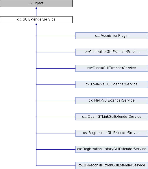 Implemented in cx::AcquisitionPlugin, cx::DicomGUIExtenderService, cx::HelpGUIExtenderService, cx::RegistrationHistoryGUIExtenderService, cx::CalibrationGUIExtenderService, cx::ExampleGUIExtenderService, cx::RegistrationGUIExtenderService, cx::UsReconstructionGUIExtenderService, and cx::OpenIGTLinkGuiExtenderService.