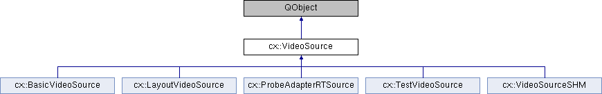 Implemented in cx::VideoSourceSHM, cx::BasicVideoSource, cx::TestVideoSource, cx::ProbeAdapterRTSource, and cx::LayoutVideoSource.