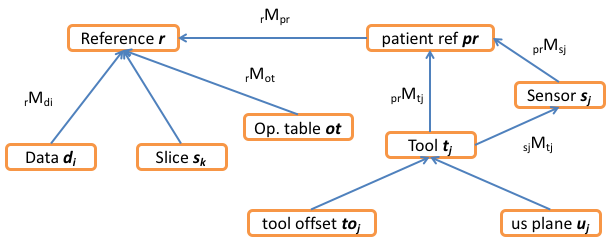 The basic spaces are reference and patient reference, representing respectively the virtual and physical world. When these two spaces have a valid relation, through the prMt transform, the system is properly set up for navigation. Tracking tools move relative to the patient reference, while data (CT, MR, US etc) are defined relative to the reference.
