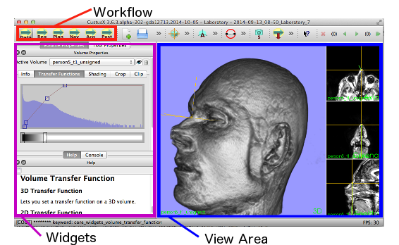 The main window present the main features of CustusX. The View Area display visualizations of volumes and models, and is the most important part of the system. Everything else is support. The Widgets are windows that contain functionality of all kinds. They are usually placed to the left, but can be dragged to all sides if needed. The Toolbar on top contains shortcuts to important functions. The most important is the Workflow Buttons, which can be used to change the main window to a specific state. The Menu (not shown in the image) also contains important functions.