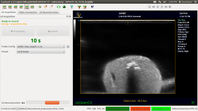 - Ultrasound reconstruction should now start automatically. This is indicated by a progress bar. Check out the console for more information about the progress. If you do not want reconstruction to start automatically after acquisition, go to Preferences->Automation and turn it off.