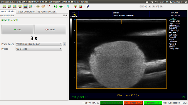 US Acquisition before start. The Ultrasonix L14-5 probe is active and ready to record. The ultrasound area is indicated by a yellow box